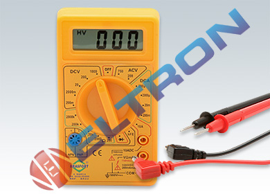 - Medições de tensão contínua e alternada, corrente contínua, resistor, transistores e diodos.
