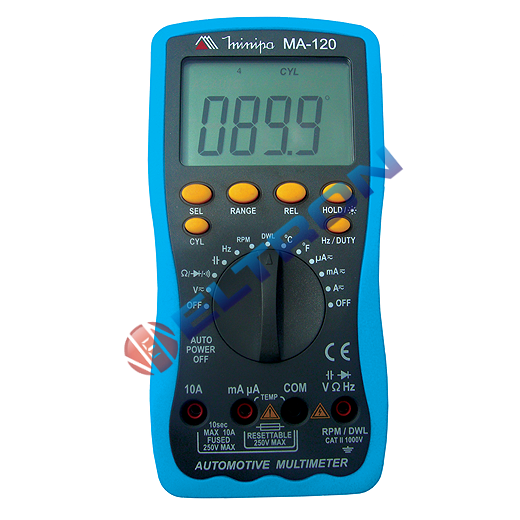 Carregando...Instrumento digital portátil com holster, LCD de 3 3/4 dígitos, com iluminação de fundo, auto desligamento, congelamento de leitura, modo relativo, mudança de faixa manual e automática.
