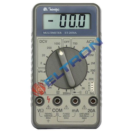 Carregando...Instrumento digital portátil, de acordo com a categoria II de segurança, possui display LCD de 3 1/2 dígitos e realiza medidas de tensão DC e AC, corrente DC até 20A, resistência e testes de diodo, transistor hFE e continuidade.