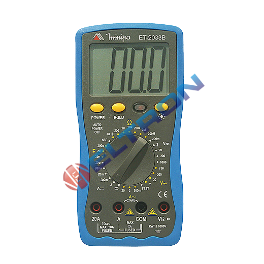 Carregando...Instrumento digital portátil, com teste de linha viva, holster protetor, LCD de 3 ½ dígitos com iluminação de fundo, de acordo com a categoria II de segurança, congelamento de leitura, desligamento automático e mudança de faixa manual. Realiza medidas de tensão DC e AC, corrente DC e AC, resistência, capacitância e testes de linha viva, hFE de transistor, diodo e continuidade
