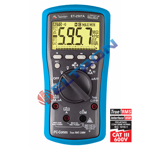 - Display: LCD 3 5/6 dígitos (6000 Contagens) com tecla de iluminação de fundo.