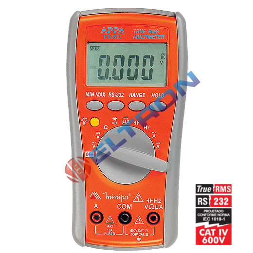 Instrumento digital portátil, de acordo com a categoria IV 600V de segurança, True RMS AC, interface RS-232, congelamento da leitura, registro de máximo e mínimo, mudança de faixa manual ou automática, desligamento automático e LCD de 3 5/6 dígitos, com iluminação de fundo.