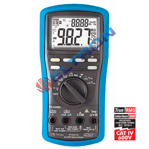 Instrumento digital portátil, de acordo com a categoria IV 600V de segurança, com medida True RMS AC, detector de campo elétrico (EF) sem contato, desligamento automático, congelamento da leitura e pico, mudança de faixa automática, registro de máximo, mínimo e média, modo relativo, holster, interface USB opcional, advertência de conexão errada das pontas de prova e LCD de 4 dígitos (ACV, DCV, Hz) ou 3 5/6 dígitos (mV, μA, mA, A, Ohms, Capacitância) com barra gráfica.