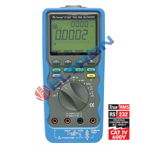 Instrumento digital portátil, de acordo com a categoria IV 600V de segurança, medidas True RMS AC / AC+DC, interface RS-232, armazenamento de dados, beep guard, modo relativo, registro de máximo, mínimo e média, congelamento da leitura e pico, auto congelamento, mudança de faixa automática ou manual, holster incorporado e LCD duplo de 4 4/5 dígitos com barra gráfica e iluminação.