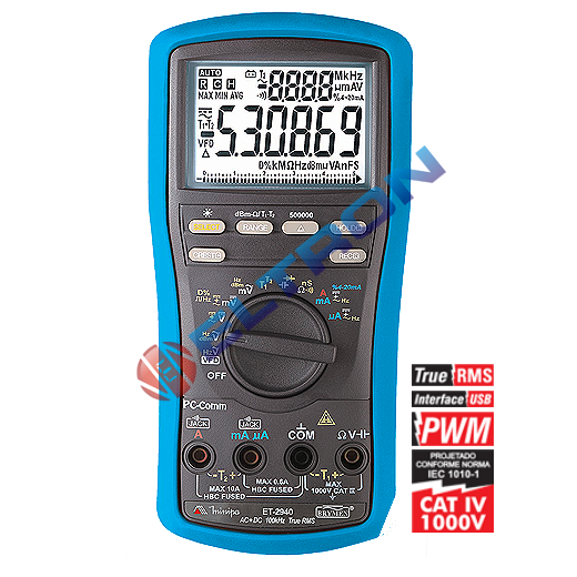 Carregando...Instrumento digital portátil, de acordo com a categoria IV 1000V de segurança, medidas True RMS AC e AC+DC, precisão básica de 0,02%, holster, interface USB e LCD com barra gráfica e resolução de 5 4/5 dígitos para tensão DC e resposta em freqüência em medidas de tensão AC de 100kHz.