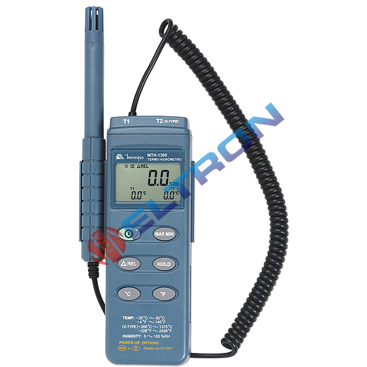 Realiza medida de temperatura T2 (padrão tipo K) de -200°C a 1370°C (-328°F a 2498°F) e T1 de -20°C a 60°C (-4°F a 140°F) e umidade relativa de 0 a 100% RH