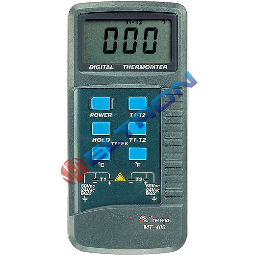 Carregando...Instrumento digital portátil, de dois canal, com LCD de 3 1/2 dígitos, resolução de 1°C ou 1°F, precisão básica de 0.3%+2°C, congelamento de leitura e função T1 - T2.